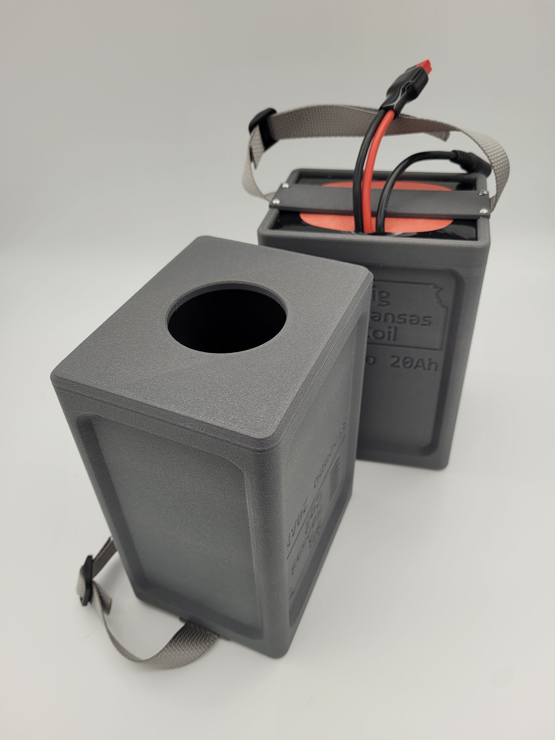 3d Printed out of Glass Fiber Filled Nylon, this shell slips right over a 20Ah Bioenno battery, is secured with brass threaded inserts and stainless hardware with a 3/4" Nylon webbing handle for easy transport.